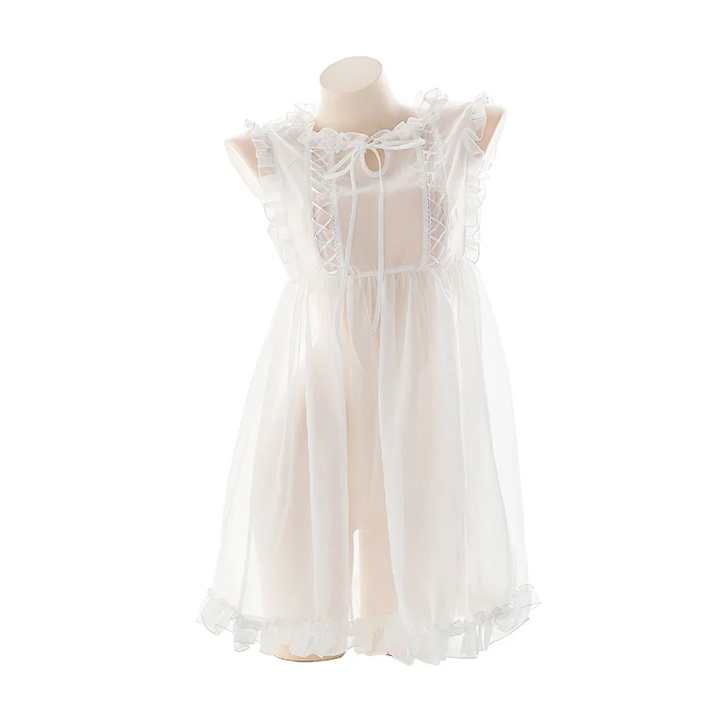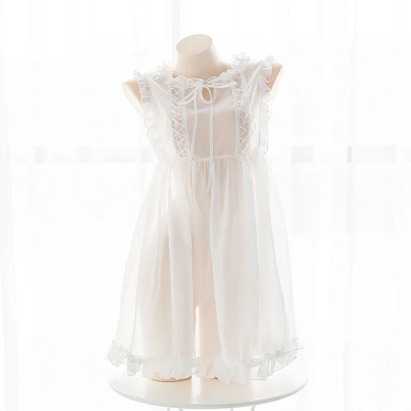 The Elven Maiden Cute Sexy Bow Lace Perspective Lingerie Set Cospaly Sweet Lolita White Ruffles Wedding Short Skirt Set