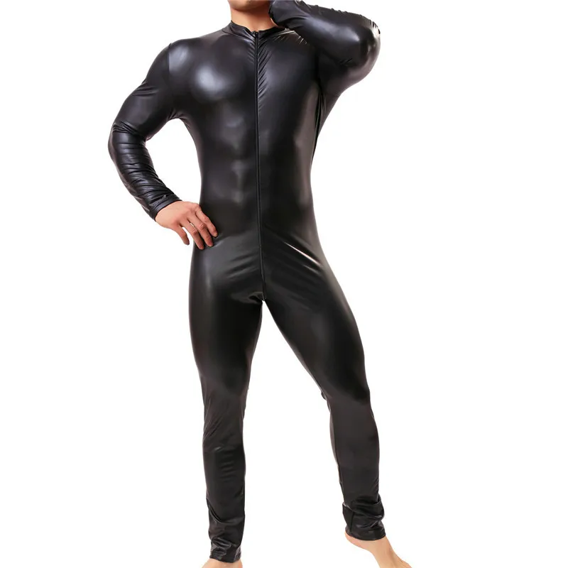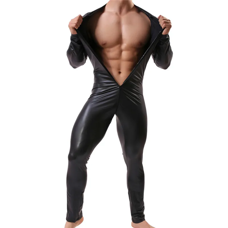 .image for Sexy Men's Bodsuits Zipper Long Sleeve Body Shaper Male Fitness One-Piece Underwear PU Leather Gay